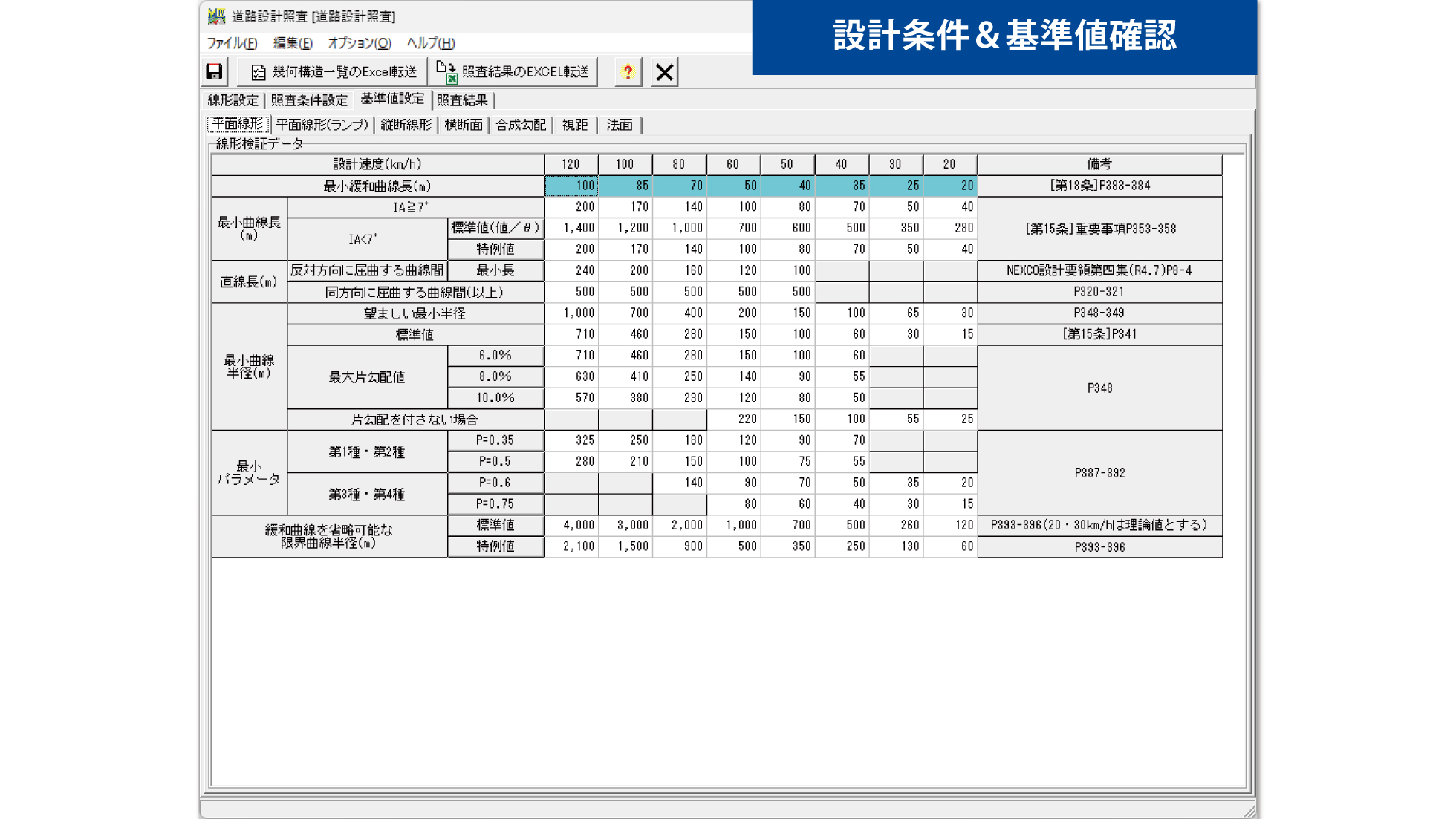 レイアウトは基準値と設計採用値が、視覚的に把握できるようになっています。