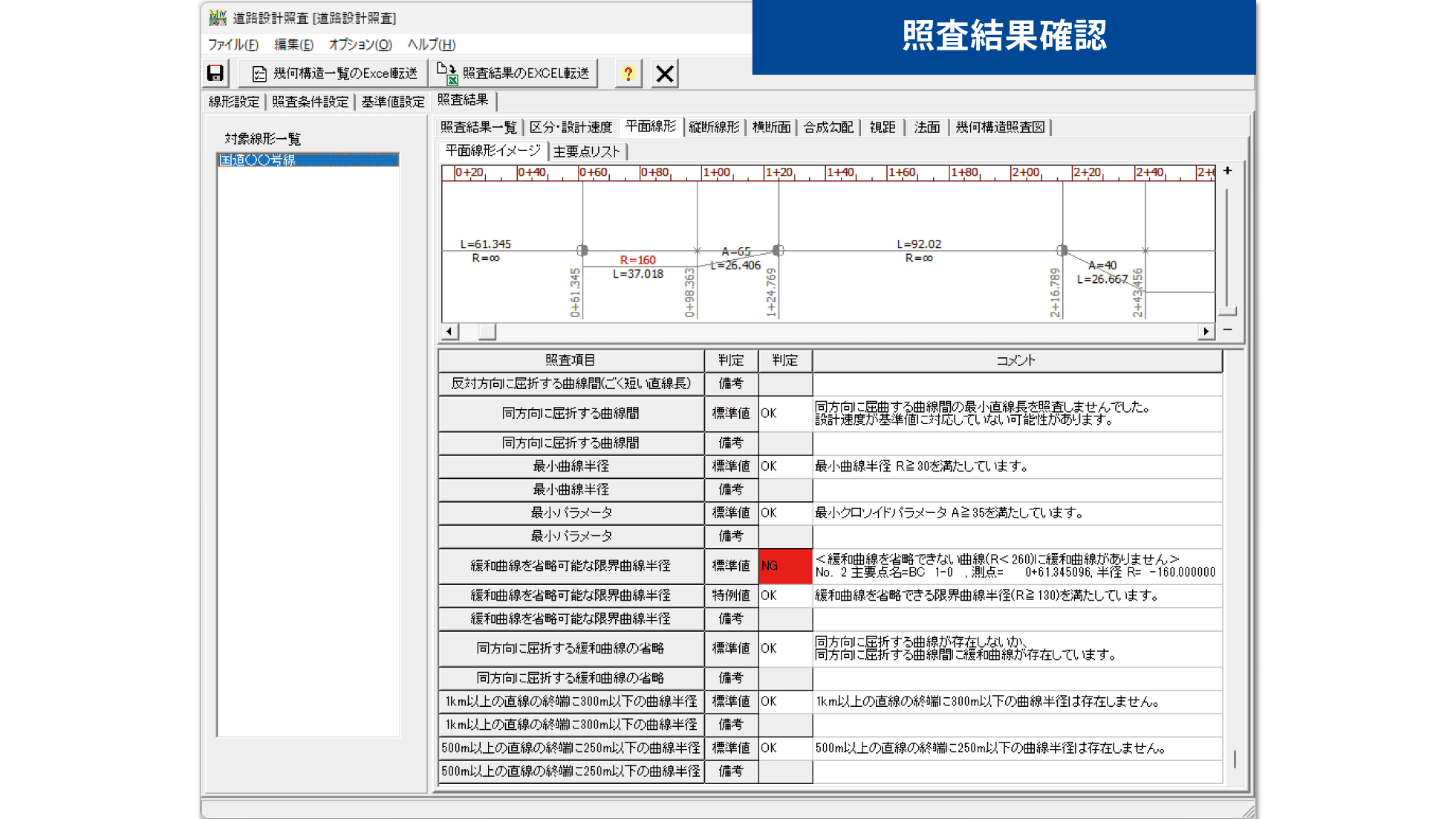 照査結果を縦断図に反映させた、幾何構造照査図も作成します。
